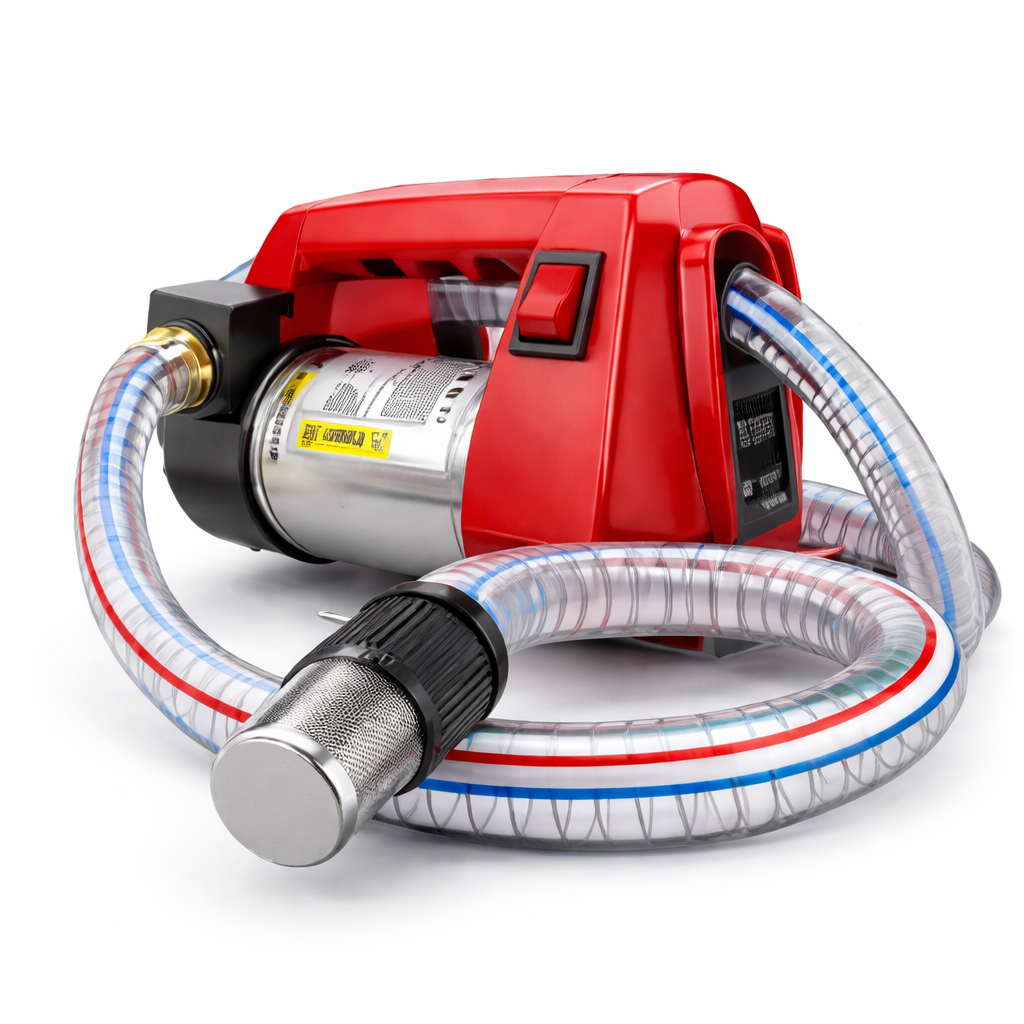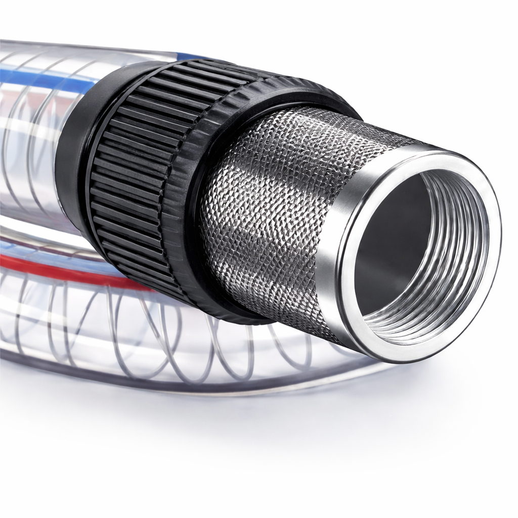 Filtr ssący chroni pompę przed zanieczyszczeniami, a solidne węże zapewniają szczelność i trwałość.