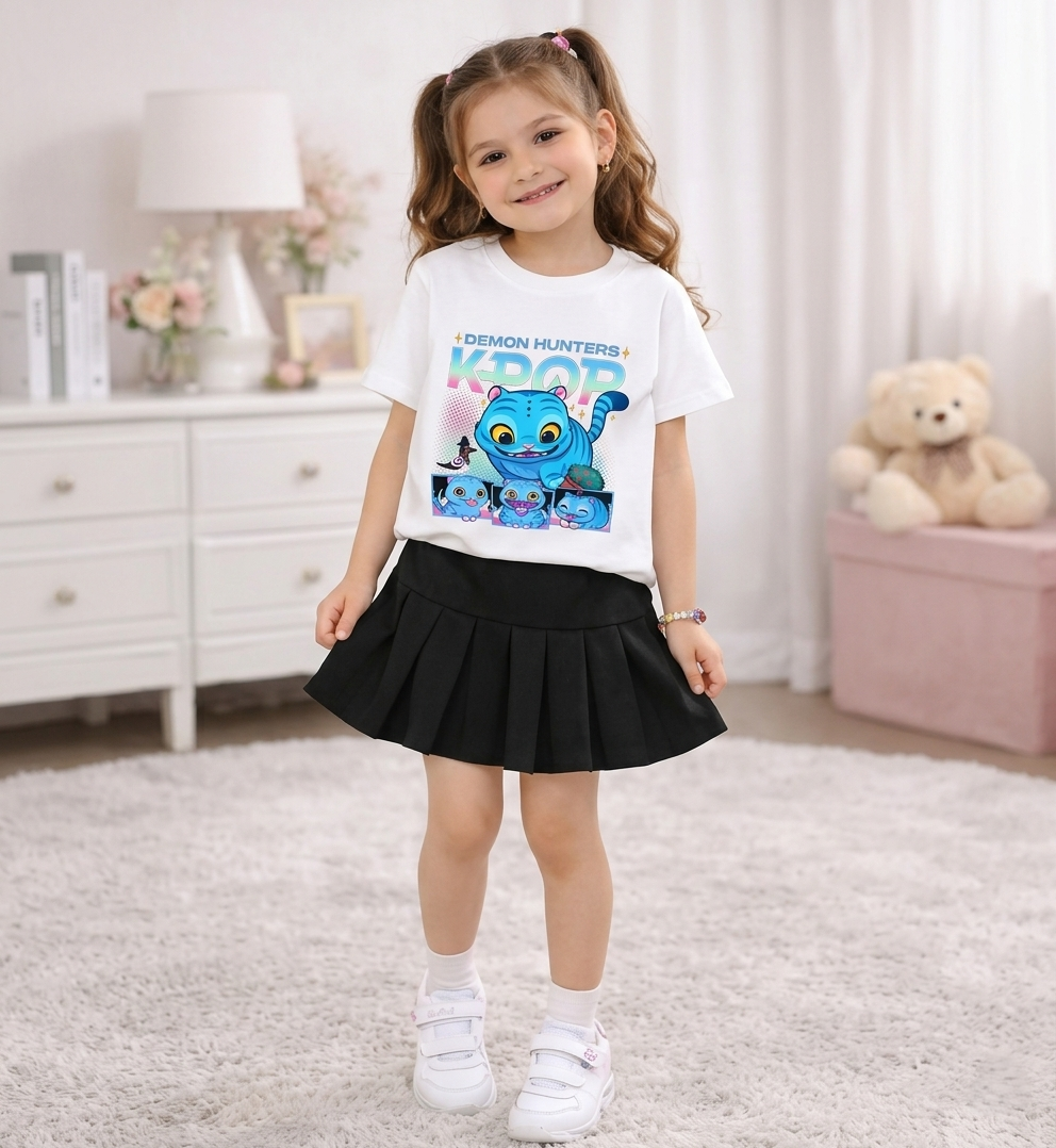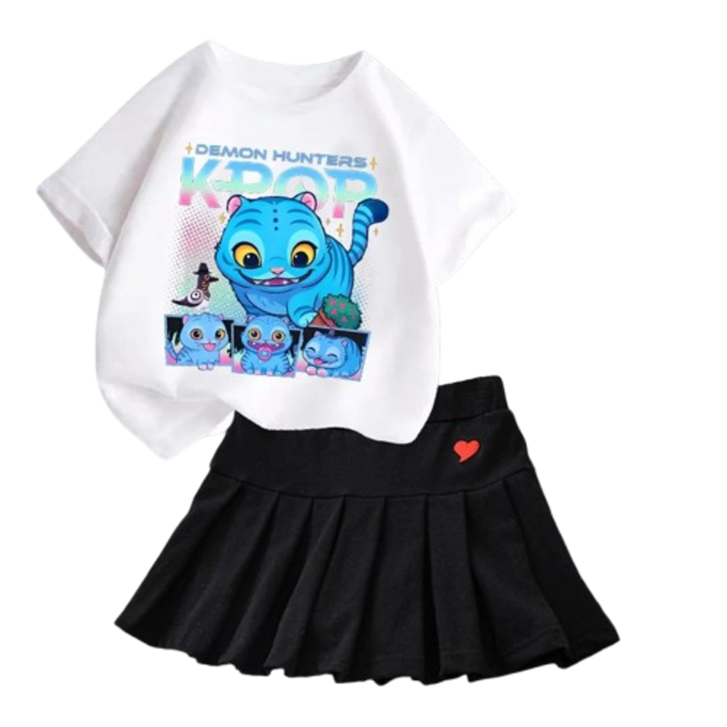 Stylowy dwuczęściowy zestaw dla dziewczynek, który łączy w sobie najnowsze trendy mody z wygodą codziennego użytkowania. Biały T-shirt z unikalną grafiką K-Pop Demon Hunter w pastelowej kolorystyce idealnie komponuje się z klasyczną, czarną spódniczką, tworząc gotowy look w estetyce K-Style.