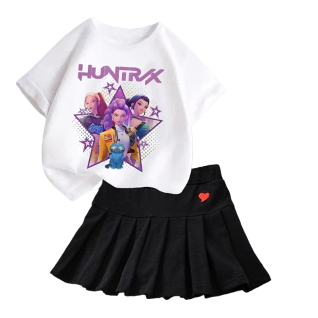 Stylowy dwuczęściowy zestaw dla dziewczynek, który łączy w sobie najnowsze trendy mody z wygodą codziennego użytkowania. Biały T-shirt z unikalną grafiką K-Pop Demon Hunter w pastelowej kolorystyce idealnie komponuje się z klasyczną, czarną spódniczką, tworząc gotowy look w estetyce K-Style.