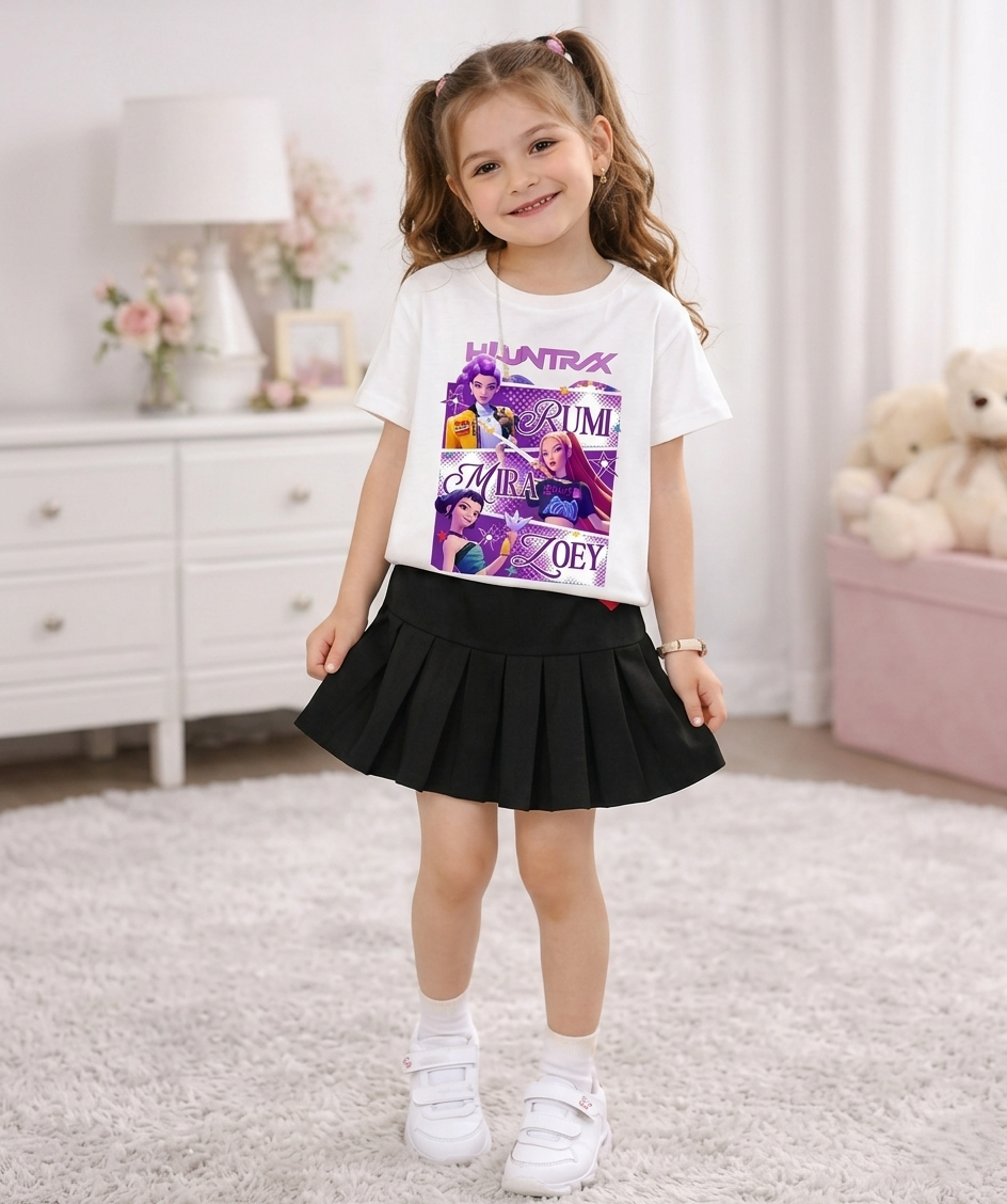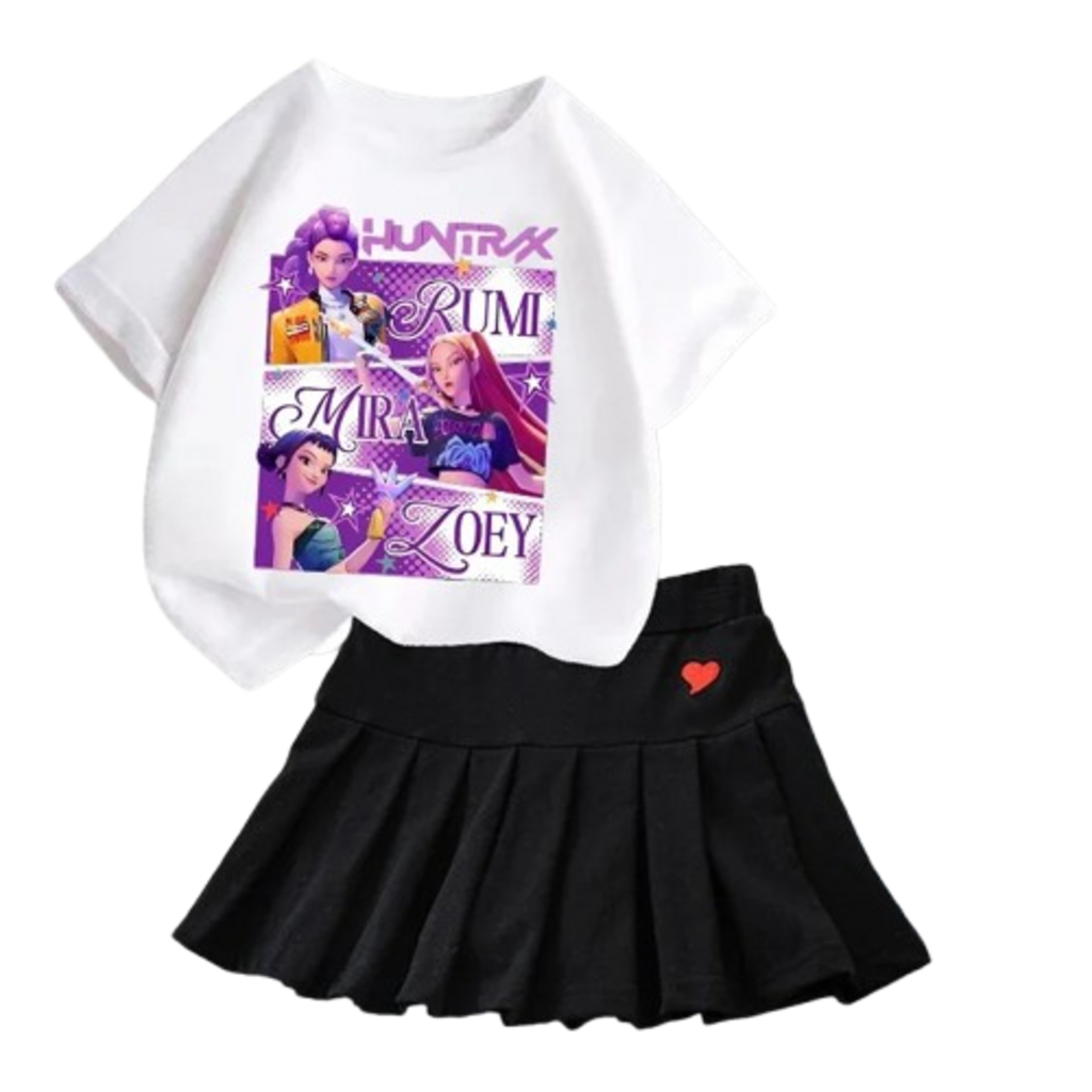 Stylowy dwuczęściowy zestaw dla dziewczynek, który łączy w sobie najnowsze trendy mody z wygodą codziennego użytkowania. Biały T-shirt z unikalną grafiką K-Pop Demon Hunter w pastelowej kolorystyce idealnie komponuje się z klasyczną, czarną spódniczką, tworząc gotowy look w estetyce K-Style.