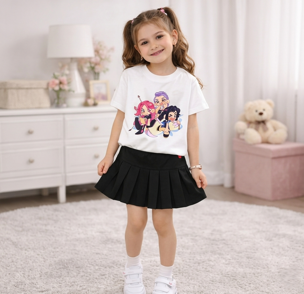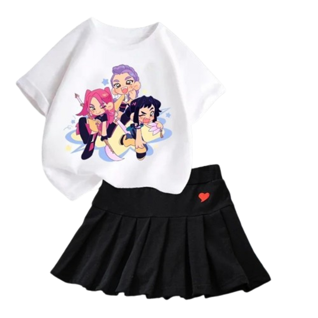 Stylowy dwuczęściowy zestaw dla dziewczynek, który łączy w sobie najnowsze trendy mody z wygodą codziennego użytkowania. Biały T-shirt z unikalną grafiką K-Pop Demon Hunter w pastelowej kolorystyce idealnie komponuje się z klasyczną, czarną spódniczką, tworząc gotowy look w estetyce K-Style.